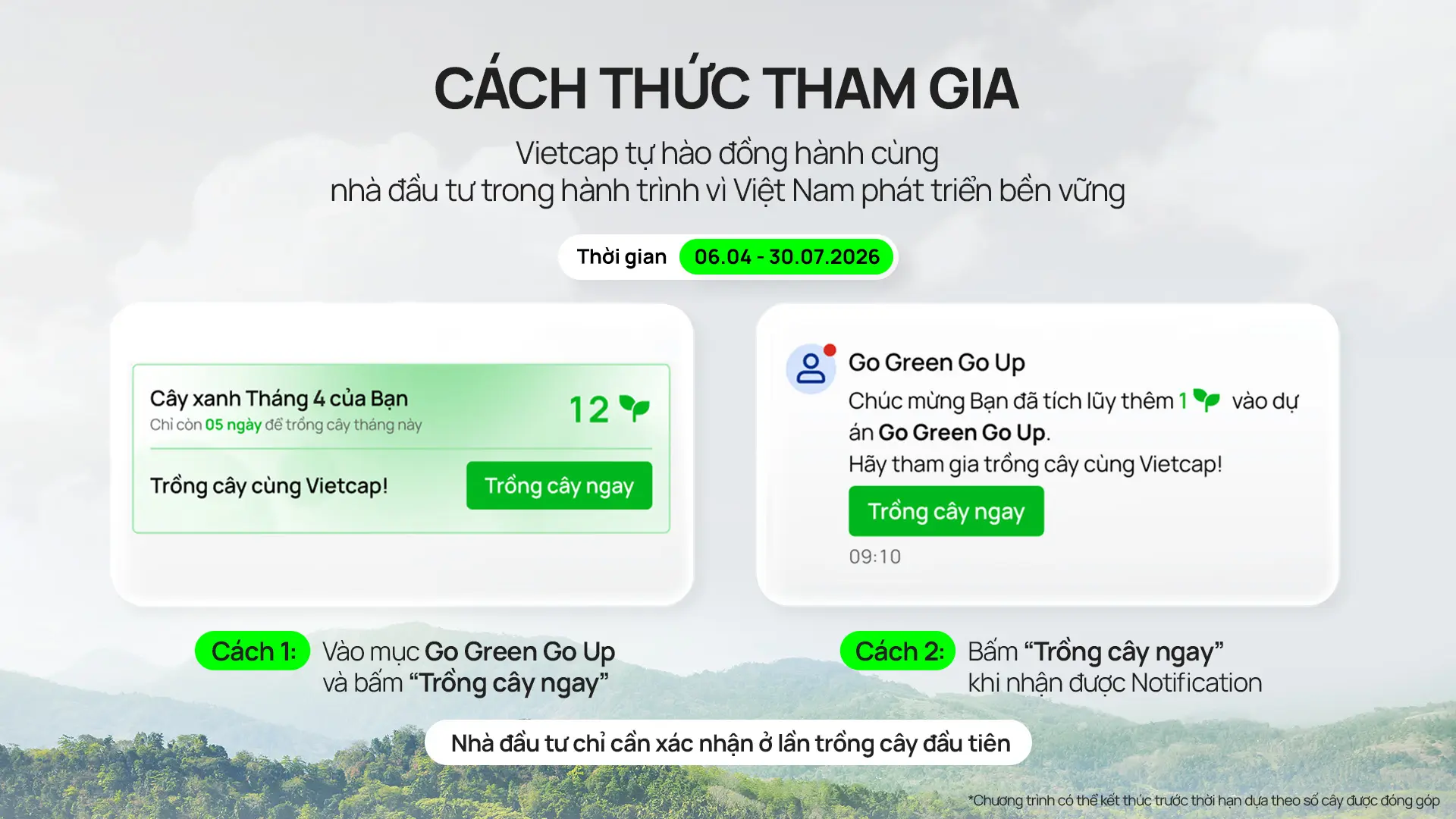 Go Green Go Up là một sáng kiến cộng đồng do Công ty Chứng khoán Vietcap thực hiện từ năm 2025, với mục tiêu “Vững xanh tài chính – Phủ xanh Việt Nam”, hướng đến sự phát triển bền vững, bảo vệ môi trường, hạn chế tác hại của thiên tai, bảo vệ nguồn nước và tạo sinh kế cho đồng bào địa phương. Năm 2026, Vietcap tiếp tục triển khai Go Green Go Up đẩy mạnh các hoạt động phủ xanh rừng và góp phần củng cố “lá chắn” tự nhiên phòng chống lũ.
