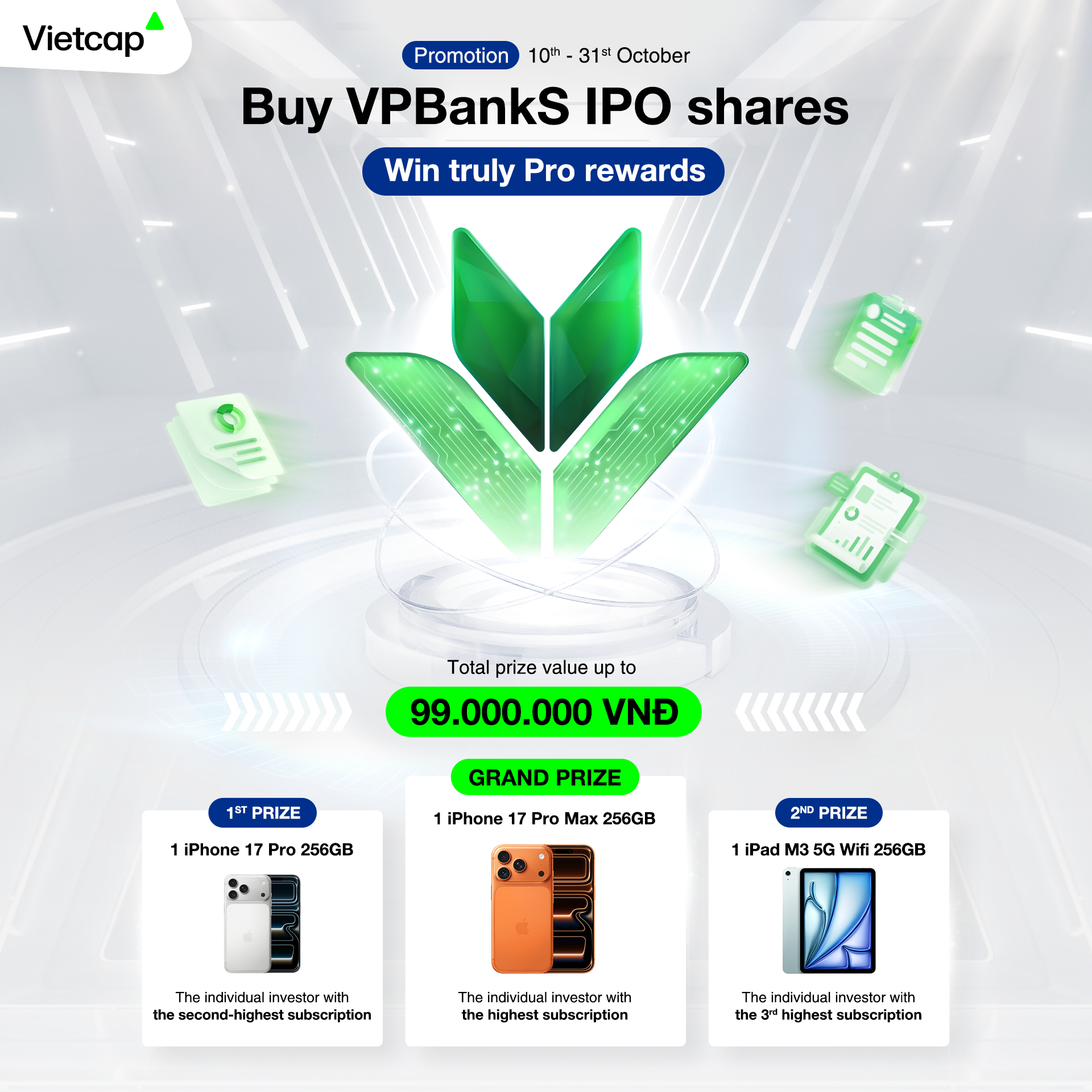 Grand Prize | iPhone 17 Pro Max 256GB | Awarded to the individual customer who registers to purchase the highest number of VPBankS shares during the IPO registration period. | 1 |