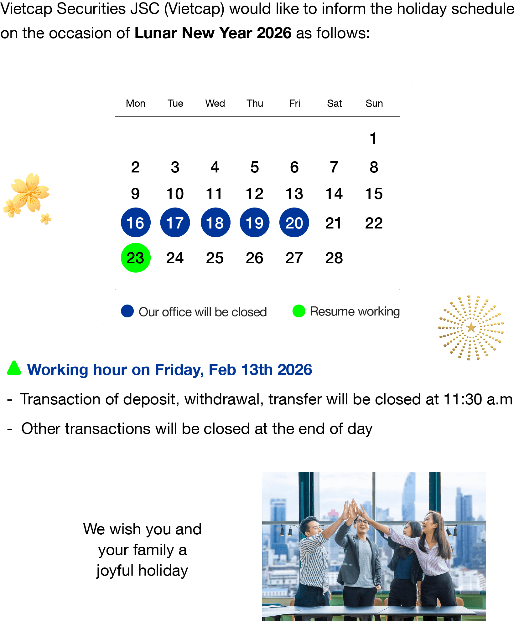 NOTICE OF LUNAR NEW YEAR HOLIDAY