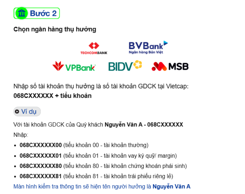 Công ty Cổ phần Chứng Khoán Vietcap phối hợp cùng các ngân hàng Techcombank, VPBank, BVBank, BIDV và MSB triển khai phương thức chuyển/nạp tiền vào tài khoản chứng khoán thông qua tài khoản định danh với các bước cơ bản sau: