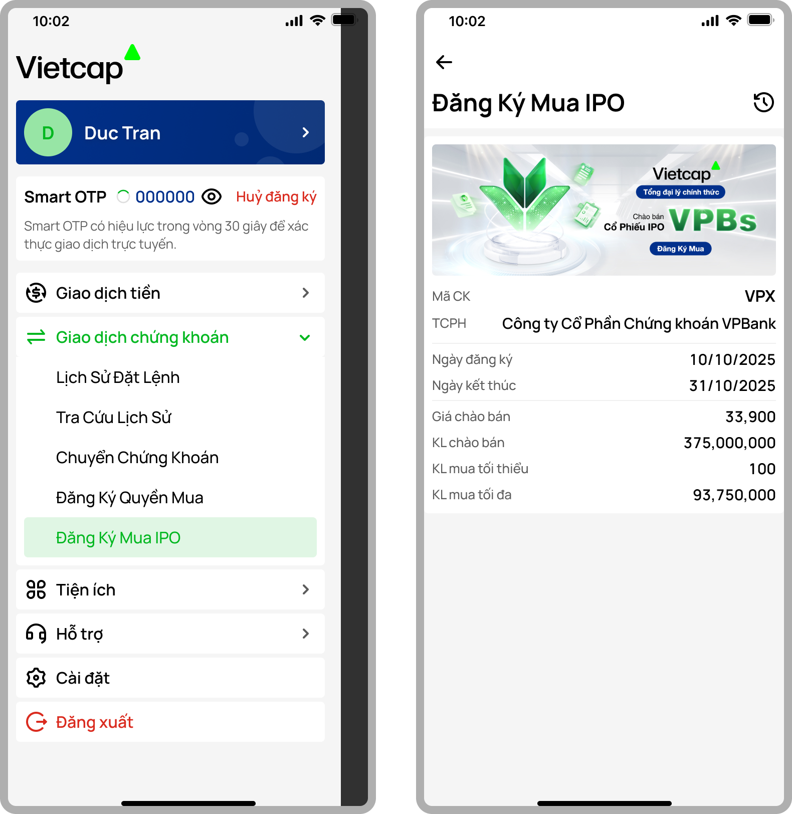 Trên Ứng dụng Vietcap, Người dùng có thể Đăng ký mua IPO Cổ phiếu và Trái phiếu do Vietcap làm Đại lý phân phối bằng cách truy cập vào Giao dịch chứng khoán và chọn Đăng Ký Mua IPO.