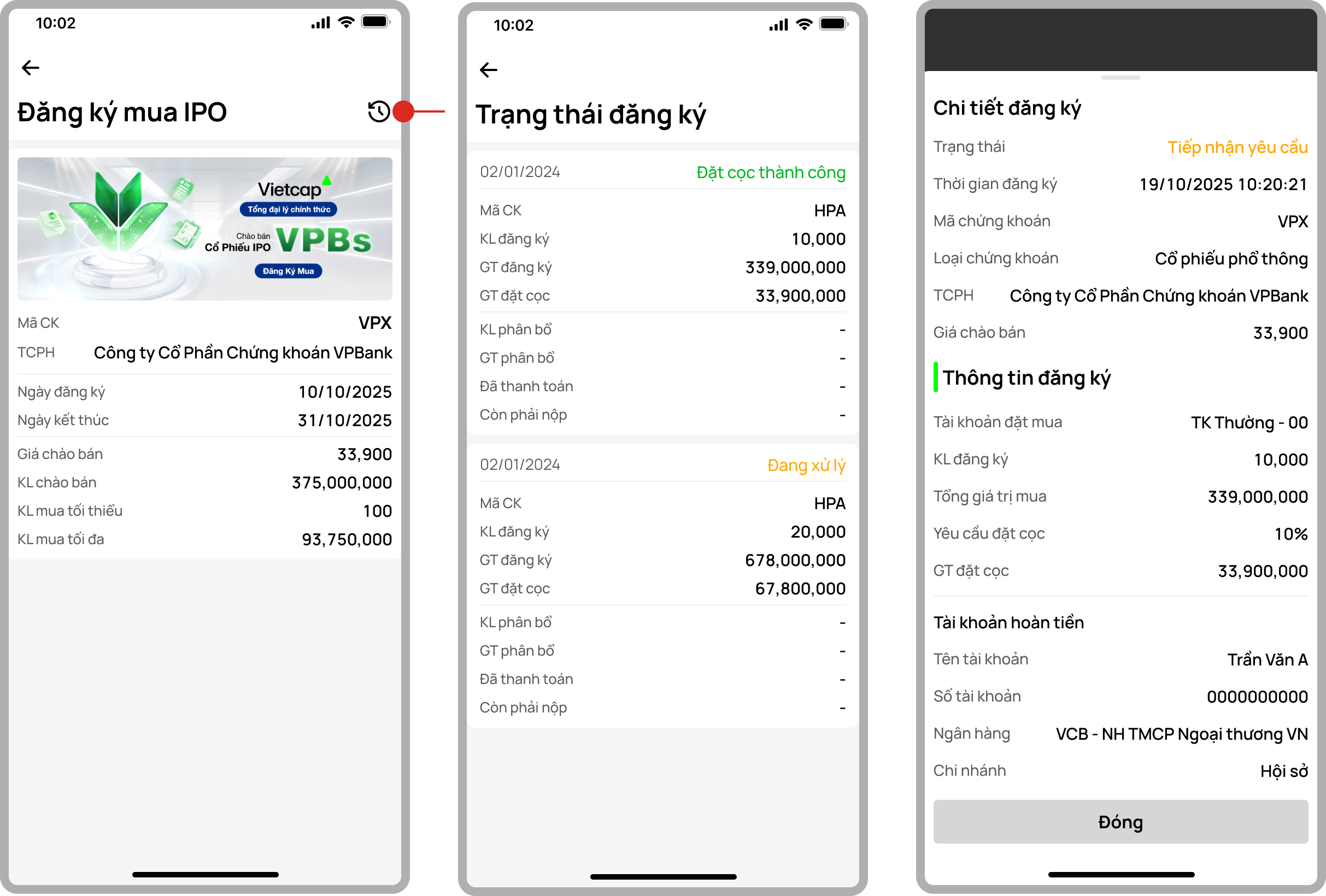 - Sau khi đăng ký, Người dùng có thể truy cập mục Giao dịch Chứng khoán -> Đăng ký mua IPO -> chọn icon Lịch sử. Bấm vào 1 giao dịch đặt mua đã thực hiện để xem chi tiết và trạng thái đăng ký.
