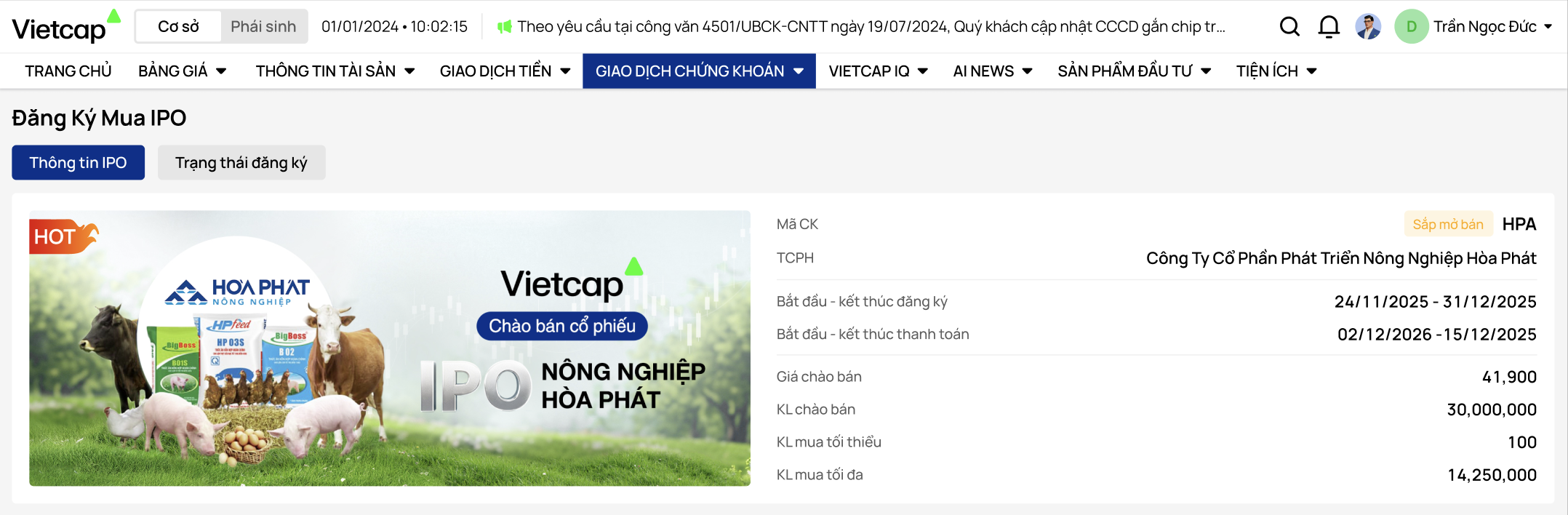 Trên Web Trading, Người dùng có thể Đăng ký mua IPO Cổ phiếu và Trái phiếu do Vietcap làm Đại lý phân phối bằng cách truy cập vào Giao dịch chứng khoán và chọn Đăng ký Mua IPO.