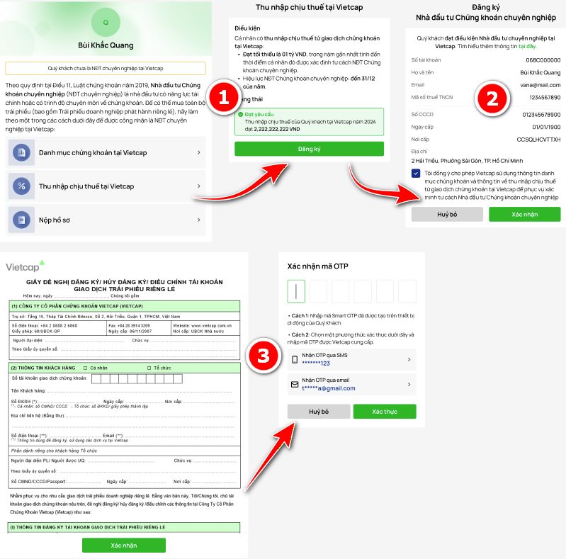 Đối với Quý NĐT đạt điều kiện trở thành NĐT CK CN, Quý NĐT cần kiểm tra lại chính xác thông tin cá nhân hiển thị trên màn hình và xác nhận đồng ý cho Vietcap truy xuất thông tin danh mục chứng khoán và/hoặc thông tin về thu nhập chịu thuế từ giao dịch chứng khoán tại Vietcap để phục vụ xác minh tư cách Nhà đầu tư Chứng khoán chuyên nghiệp.