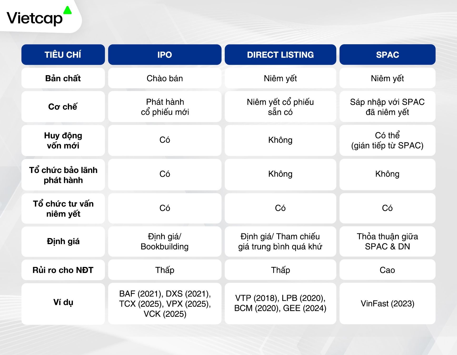 Cơ chế | Phát hành cổ phiếu mới | Niêm yết cổ phiếu sẵn có | Sáp nhập với SPAC đã niêm yết |