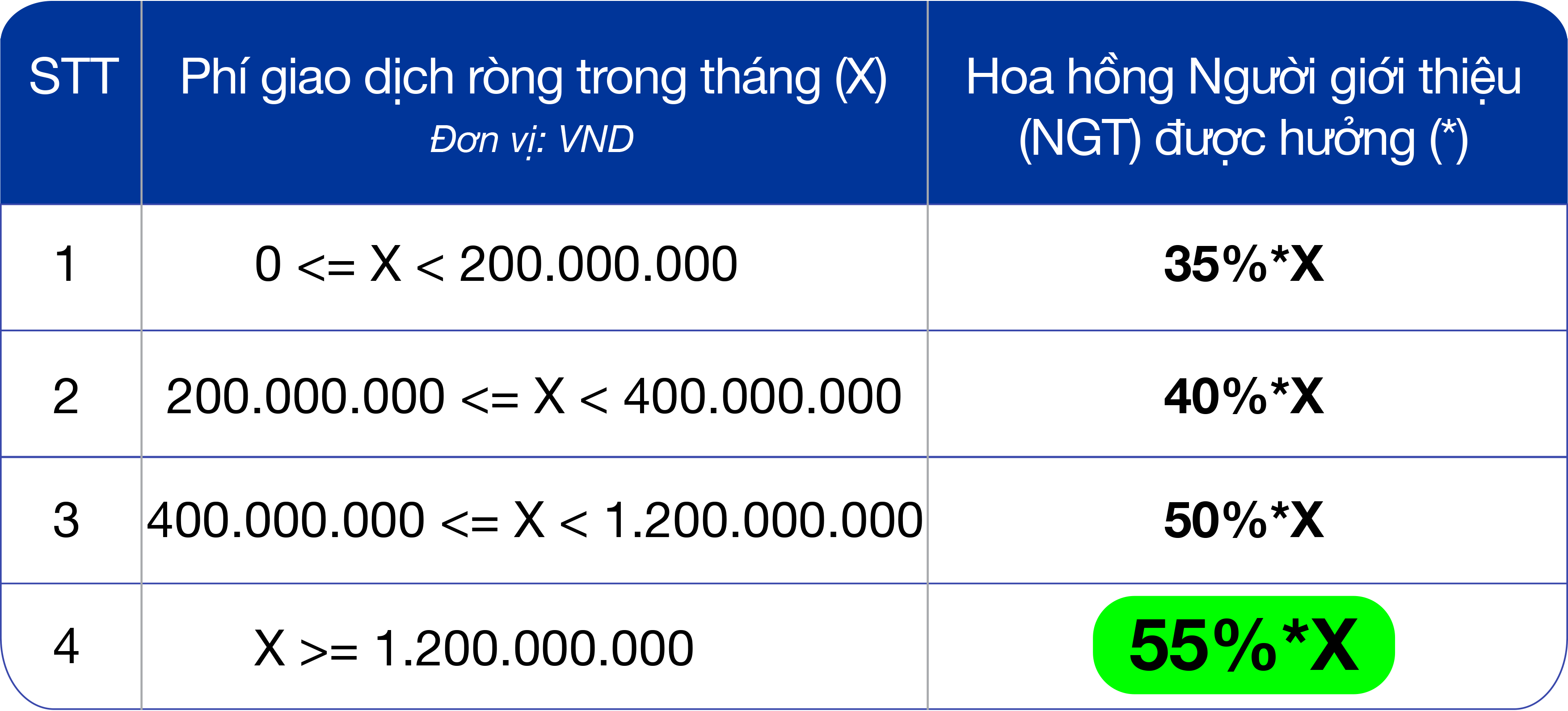 Chính sách hoa hồngHoa hồng được tính trên Phí giao dịch ròng của từng loại chứng khoán, trong đó: