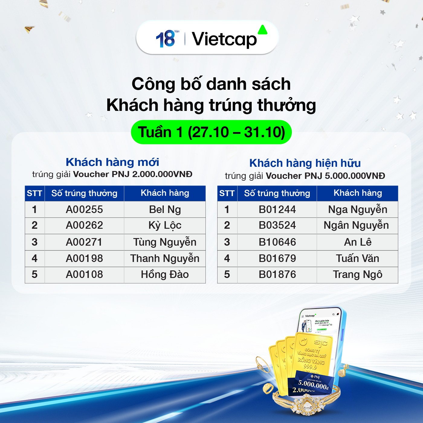 Vietcap trân trọng cảm ơn Quý nhà đầu tư đã nhiệt tình tham gia Tuần 1 của chương trình 3 Tuần Thử Thách Với Đường Đua Đầu Tư. Sau khi tiến hành Livestream Quay số may mắn trên Fanpage chính thức, Vietcap vui mừng công bố danh sách những khách hàng may mắn trúng thưởng Tuần 2 như hình bên dưới.
