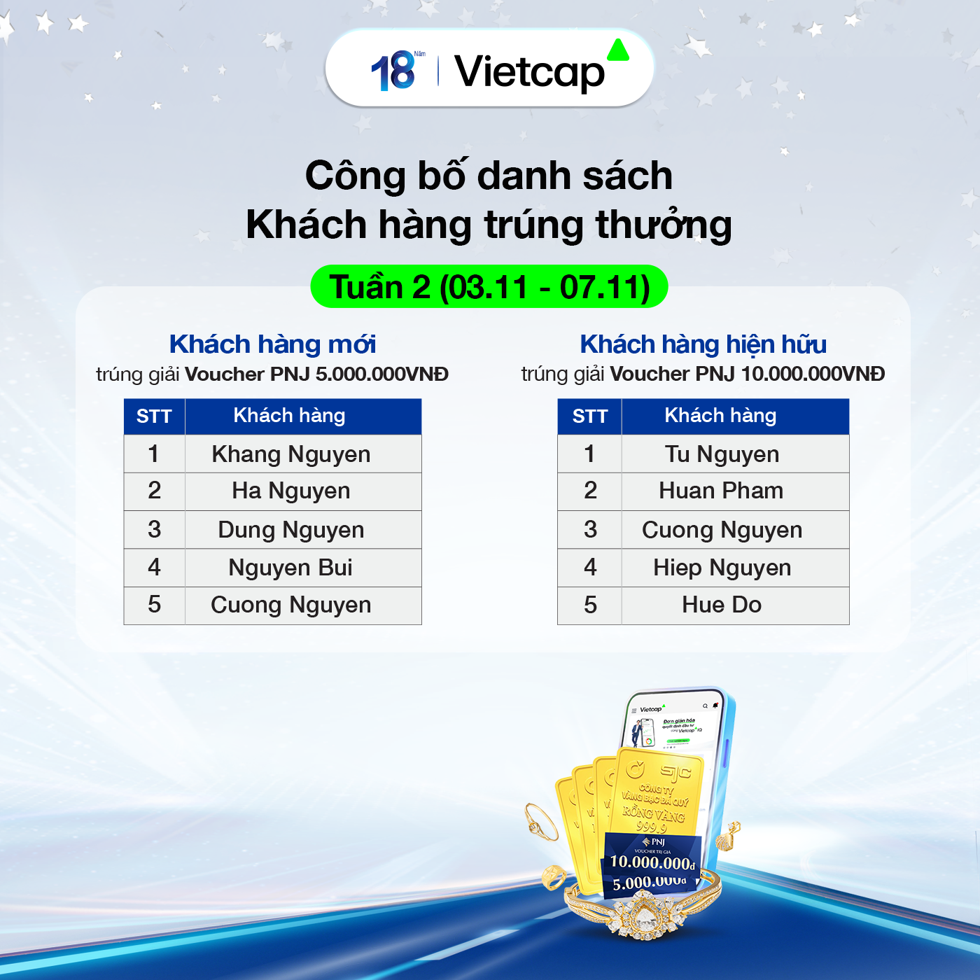 Vietcap trân trọng cảm ơn Quý nhà đầu tư đã nhiệt tình tham gia Tuần 2 của chương trình 3 Tuần Thử Thách Với Đường Đua Đầu Tư. Sau khi tiến hành Livestream Quay số may mắn trên Fanpage chính thức, Vietcap vui mừng công bố danh sách những khách hàng may mắn trúng thưởng Tuần 2 như hình bên dưới.