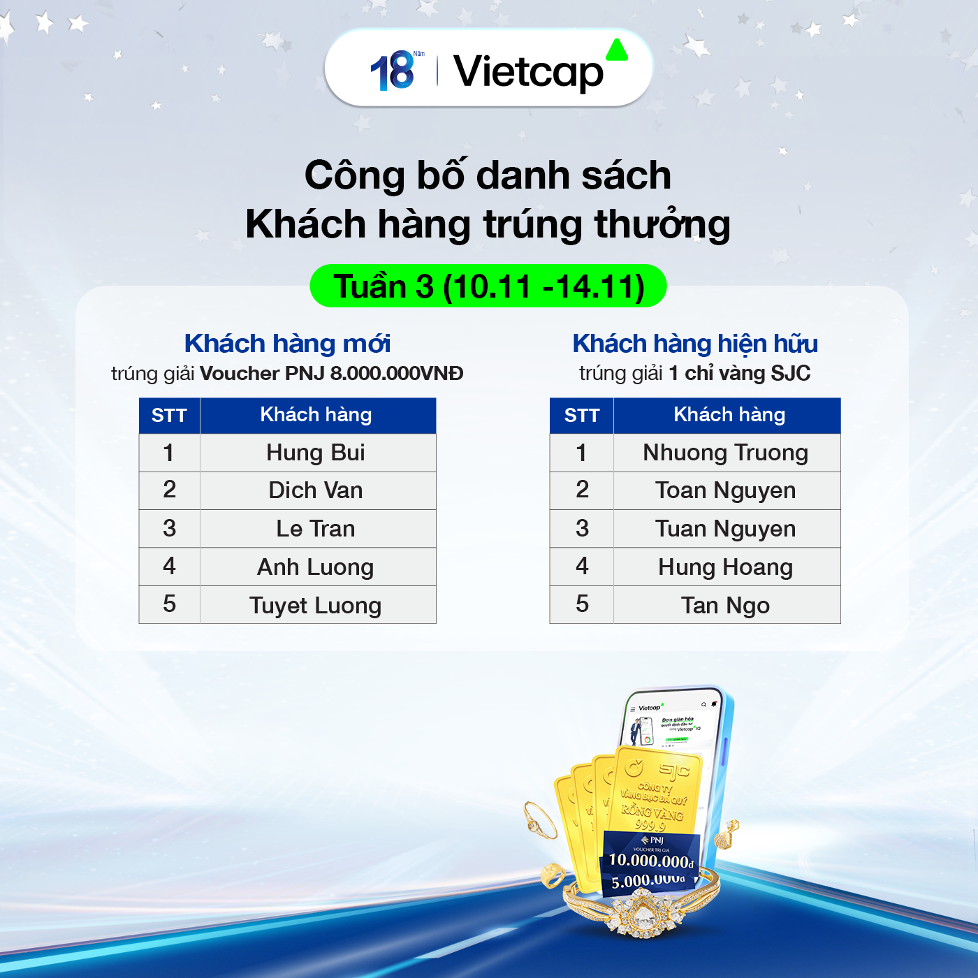 Vietcap trân trọng cảm ơn Quý nhà đầu tư đã nhiệt tình tham gia Tuần 2 của chương trình 3 Tuần Thử Thách Với Đường Đua Đầu Tư. Sau khi tiến hành Livestream Quay số may mắn trên Fanpage chính thức, Vietcap vui mừng công bố danh sách những khách hàng may mắn trúng thưởng Tuần 3 như hình bên dưới.