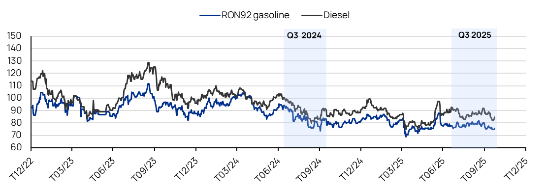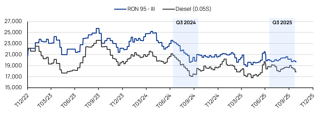 - Tổng Công ty Dầu Việt Nam (OIL) đã công bố KQKD quý 3/2025 với doanh thu đạt 32,8 nghìn tỷ đồng (+5% YoY) và LNST sau lợi ích CĐTS báo cáo đạt 125 tỷ đồng (+351% YoY). LNST sau lợi ích CĐTS cốt lõi tăng mạnh 295% YoY lên mức 85 tỷ đồng. Sự phục hồi mạnh mẽ của lợi nhuận chủ yếu được thúc đẩy bởi (1) mức tăng 12% YoY của sản lượng bán trong nước, nhờ được hỗ trợ bởi hoạt động mở rộng mạng lưới, với 915 cửa hàng COCO được OIL vận hành tính đến cuối tháng 9 (+9,1% so với đầu năm), cùng với (2) mức tăng 0,4 điểm % của biên lợi nhuận gộp. Các yếu tố tích cực này đã bù đắp cho (3) mức tăng 14% YoY của chi phí bán hàng và (4) mức tăng 76% YoY của chi phí lãi vay.