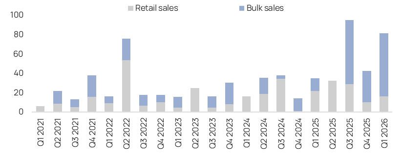 - Doanh số bán lô lớn đóng góp khoảng 80% vào tổng doanh số bán BĐS trong quý 1/2026 (81,7 nghìn tỷ đồng; +91% QoQ và +133% YoY), chủ yếu được dẫn dắt bởi Green Paradise và Ocean Park 2&3. Trong cuối tháng 3 và đầu tháng 4/2026, VHM đã mở bán lẻ đợt đầu dự án Hải Vân Bay (Đà Nẵng; 512 ha với 5.900 căn thấp tầng), và dự án này đã bắt đầu đóng góp vào doanh số bán BĐS của VHM trong quý 1/2026. Số liệu doanh số bán BĐS được công bố trong quý 1/2026 nhìn chung phù hợp với số liệu sơ bộ được công ty công bố tại ĐHCĐ của công ty (chi tiết xem tại Báo cáo ĐHCĐ của chúng tôi).